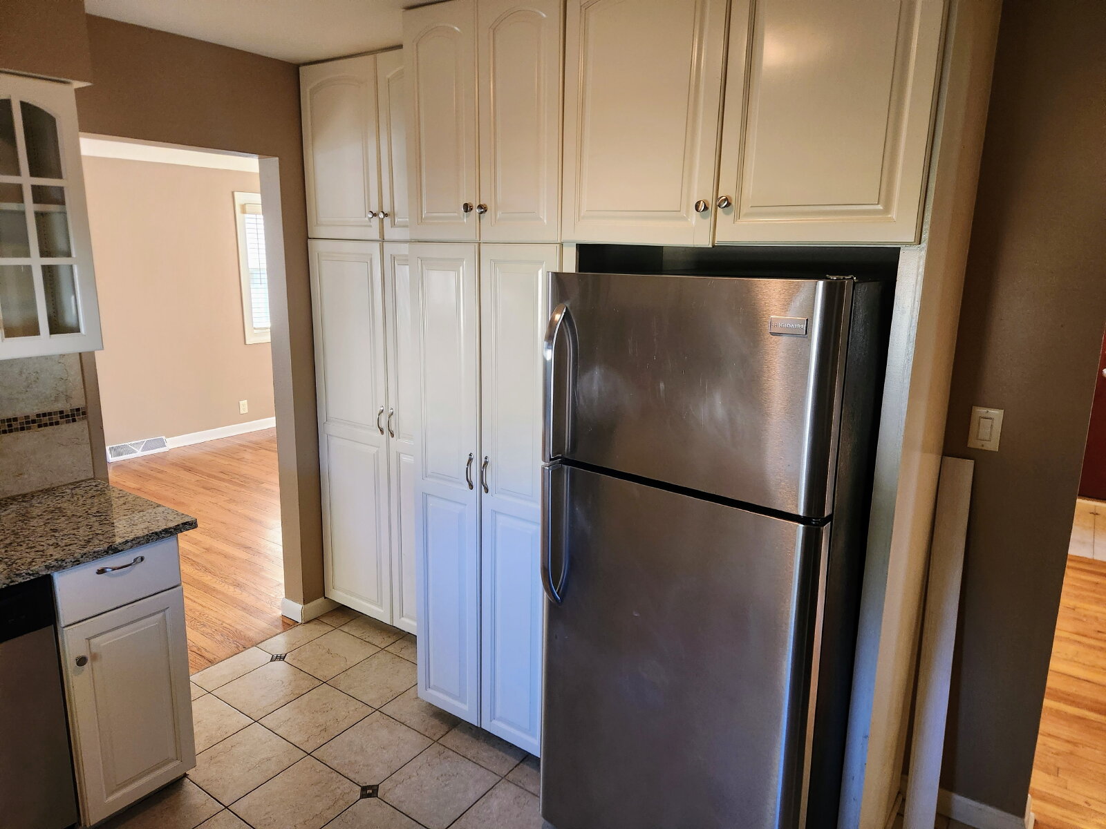 The main level features a large living room that flows seamlessly into the dining area—perfect for gatherings and everyday living. A door off the dining room leads to the back patio, providing convenient indoor-outdoor access for grilling, relaxing, or entertaining. The kitchen includes granite countertops and stainless steel appliances (refrigerator, oven, microwave, dishwasher), plus plenty of cabinet space. A half bathroom is also located on the main floor for added convenience.