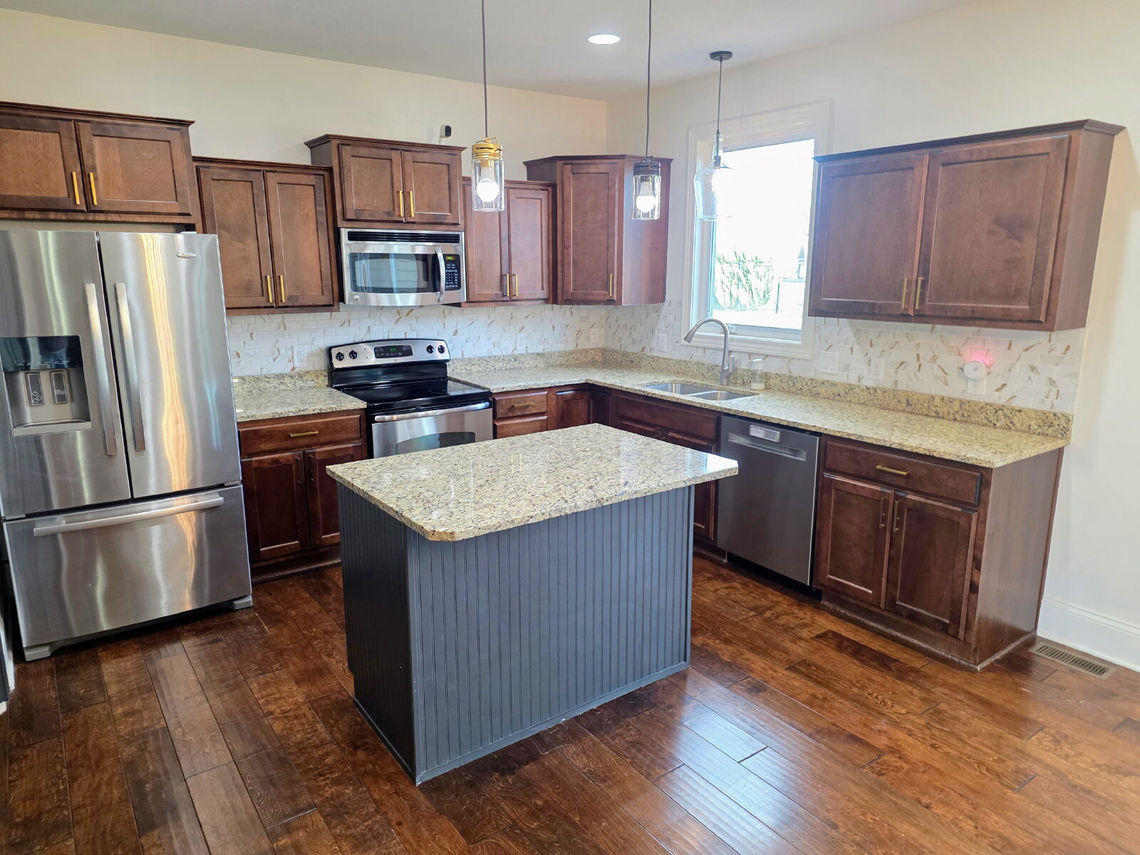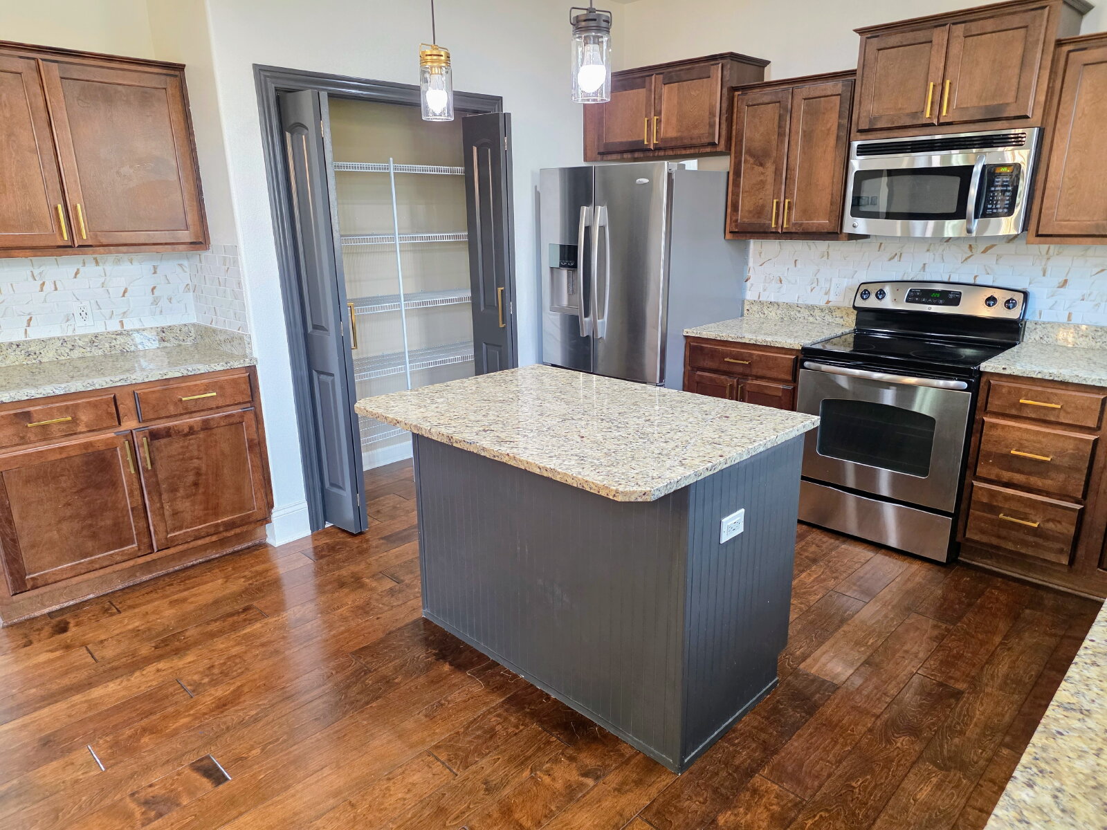 Gourmet Kitchen: The heart of the home features a center island, high-end stainless steel appliances, and a large pantry.